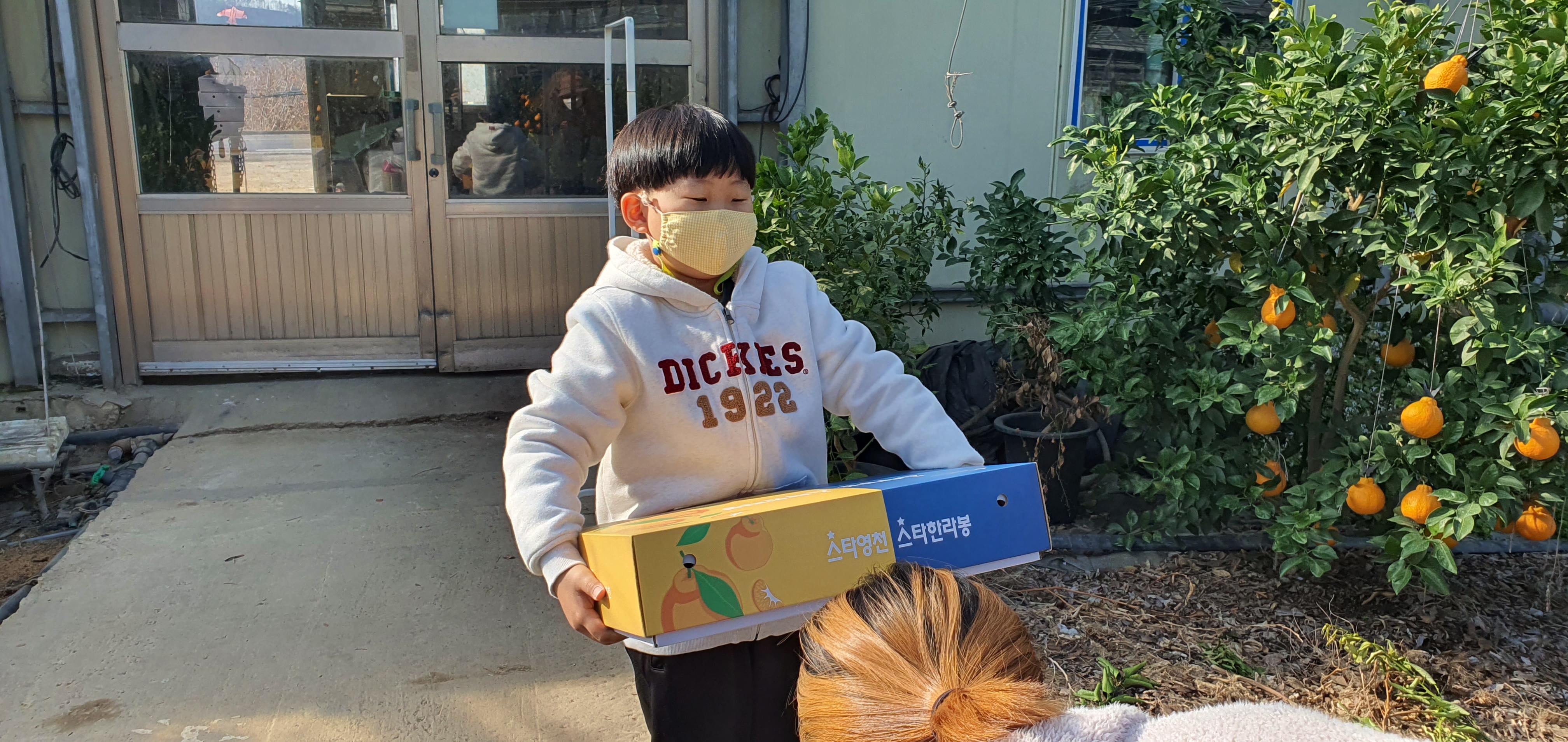 뿌듯한 표정으로 포장된 상자를 들고 나오는 큰 아이 모습이예요.