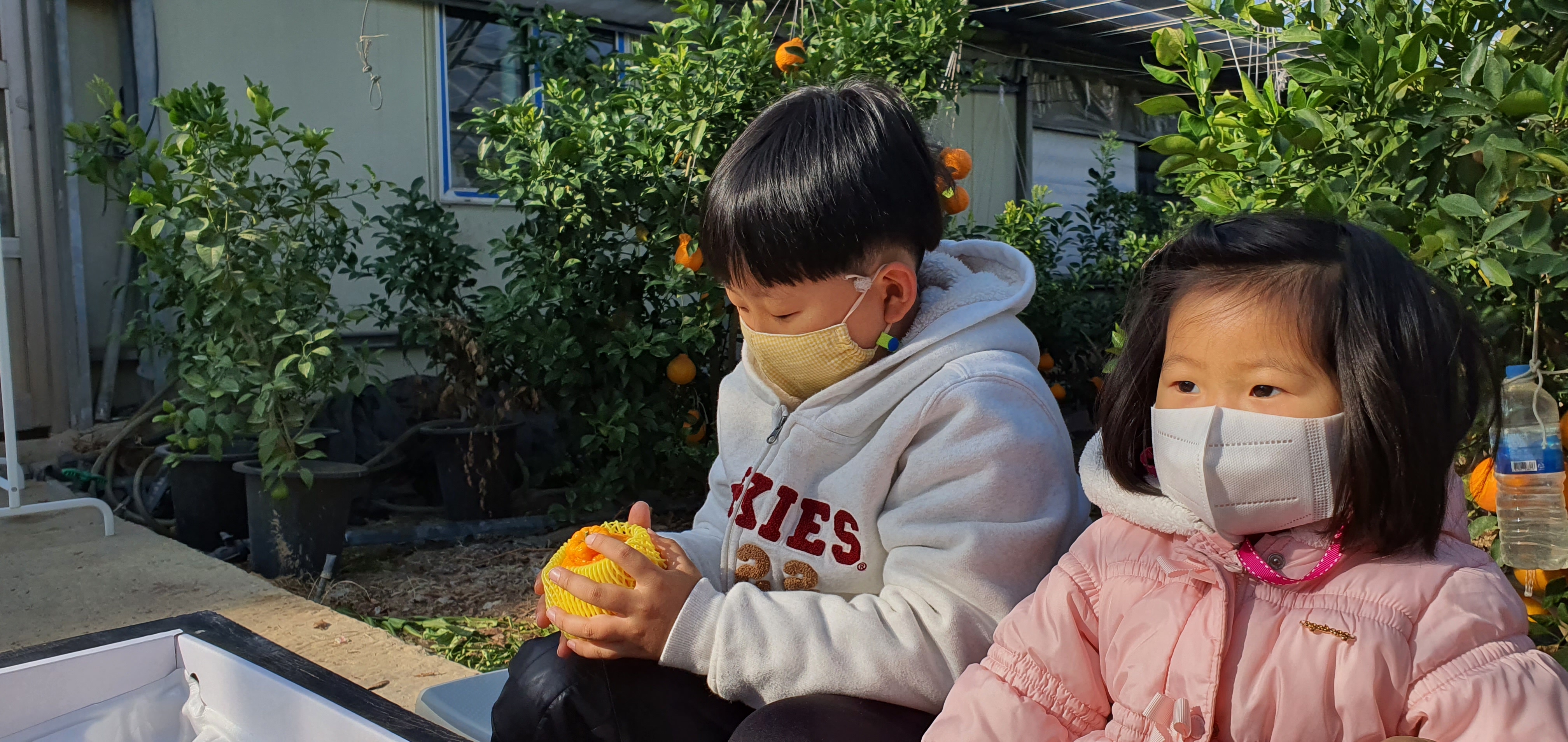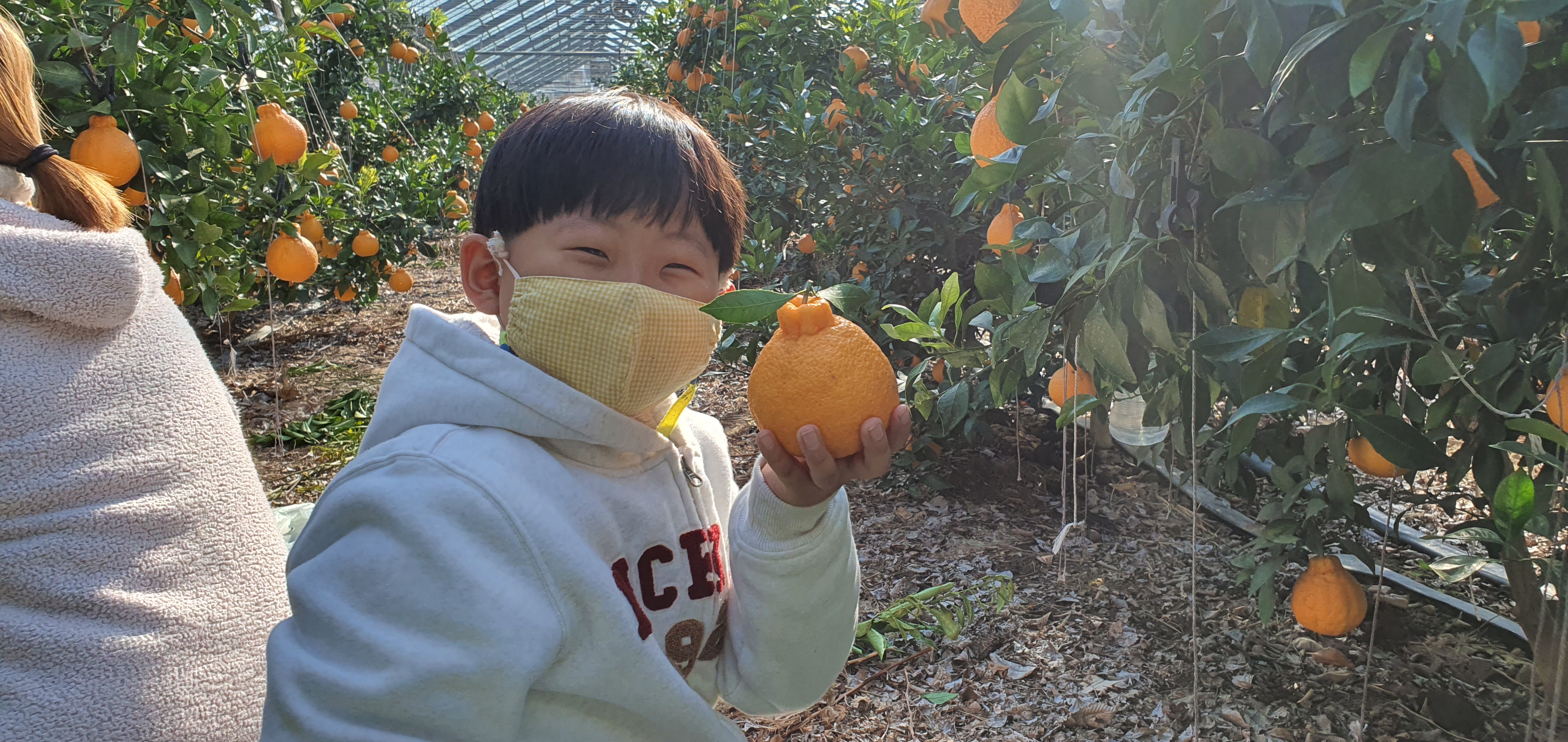 딸도 집중해서 한라봉을 잡고 있어요.